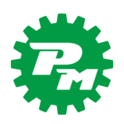 Logo Pauli Maschinenbau in weiß, Schraube mit Initialen PM in der Mitte